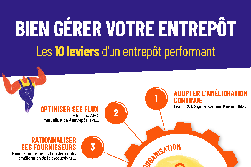 La gestion d’un entrepôt est plus complexe que ce qu’il en parait. Les aspects importants sont, par exemple, l'organisation, la gestion, l'analyse des données et l'innovation et la technologie. Au sein de ces 4 aspects, nous avons répertorié 10 leviers pour vous. Découvrez ces 10 leviers pour un entrepôt parfaitement fonctionnel dans notre infographie.