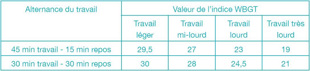 Vous pensez qu’il fait trop chaud dans votre entrepôt pour y laisser travailler vos collaborateurs ? Plusieurs mesures sont prévues pour les soulager. Attention, la température de l’air ambiant n’est pas le seul facteur décisif en la matière. Pour mesurer l’impact de la chaleur dans un environnement industriel, il vous faudra en effet consulter l’indice WBGT (wet bulb globe temperature) ou de Température au thermomètre-globe mouillé. Les valeurs de cet indice sont inférieures de 5 °C aux valeurs d’un thermomètre traditionnel et tiennent notamment compte de la température ambiante, de la chaleur rayonnante émise par les machines et du taux d’humidité présent dans l’air. Il est impossible de mesurer l’indice WBGT avec un thermomètre classique, mais il est possible d’estimer sa valeur à l’aide de tableaux (voir la page 17 de cette brochure du SPF Emploi, Travail et Concertation sociale). Vous connaissez le degré de difficulté lié à vos activités ? Vous pouvez alors déduire l’indice WBGT maximal autorisé sur votre lieu de travail :