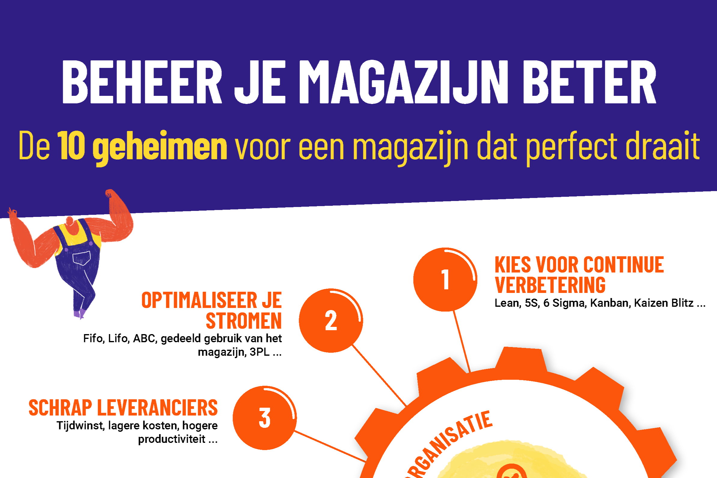 Bij het beheren van een magazijn komt meer kijken dan je in eerste instantie denkt. Belangrijke aspecten zijn bijvoorbeeld de organisatie, het management, de data analyse en innovatie en technologie. Binnen al deze 4 aspecten hebben 10 geheimen voor je op een rijtje gezet. Ontdek deze 10 geheimen voor een perfect draaiend magazijn in onze infographic.