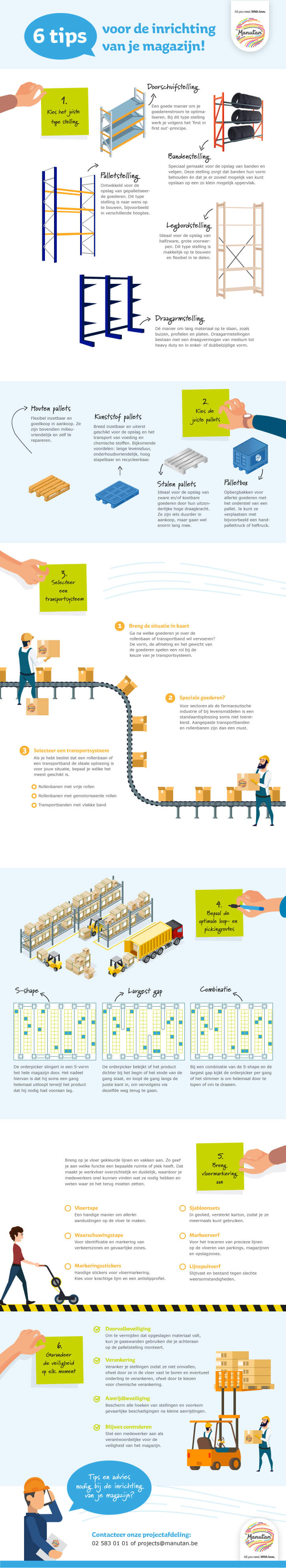 Geen idee hoe je je magazijninrichting precies moet aanpakken of waarop je moet letten? Onze infographic zet alle aandachtspunten op een rijtje: