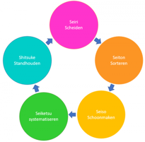 De 5S-methode komt, net als Marie Kondo, uit Japan, maar is specifiek gericht op de werkvloer. 5S verwijst naar de vijf Japanse woorden die de methode samenvatten: