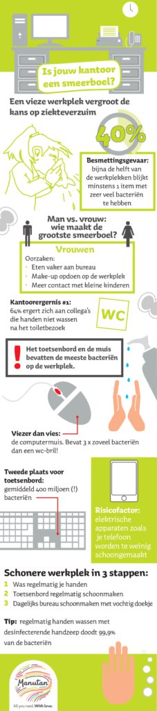 Een tekort aan persoonlijke hygiëne is ergernis nummer één onder collega’s. Toch is een gebrekkige hygiëne niet alleen ergerlijk, maar ook heel ongezond. Je brengt met je collega’s veel tijd op eenzelfde plaats door, en als niet iedereen hygiëne hoog in het vaandel draagt, kan er zelfs een griepepidemie op de loer liggen.