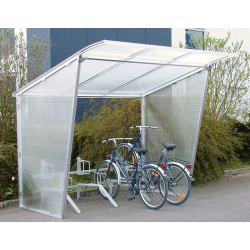 Abri cycles à paroi polycarbonate semi-opaque. Large lame de recouvrement inclinée sur l'avant. Panneau de toiture solide à double paroi (10 mm). Assemblage simple des parties latérales par boulon. Support-cycles gain de place avec bras intercalés.
