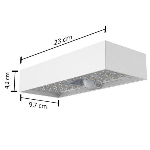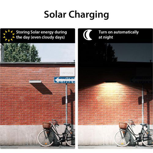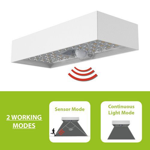 Applique solaire à LED en polycarbonate anti-UV et ABS, design contemporain et extrêmement raffiné , IP65: résistante aux chocs et aux intempéries , la partie électronique est particulièrement résistante à l'eau. Fonctionnement : la lampe se recharge pendant la journée, grâce aux rayons du soleil. 2 modes d'utilisation : 1) La lampe s'allume automatiquement la nuit et maintient une luminosité de 50%, pendant 5 heures. Après quoi (ou lorsque la charge de la batterie est inférieure à 30%), la lampe passe en mode économie d'énergie : la lampe s'allume automatiquement à 100% de luminosité lorsqu'un mouvement est détecté à une distance ≤6 mètres, puis s'éteint après 20 secondes d'absence de mouvement. 2) Mode détecteur de mouvement : la lampe s'allume automatiquement la nuit à 100 % de luminosité lorsqu'elle détecte un mouvement à une distance de ≤ 6 mètres, puis passe à 5 % de luminosité après 20 secondes d'inactivité. La lampe est équipée de LED SMD de dernière génération avec un diffuseu