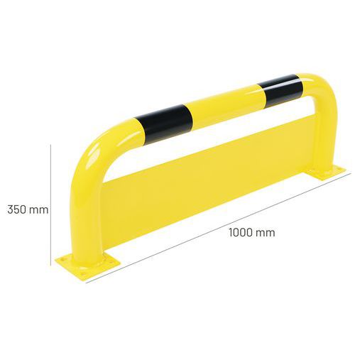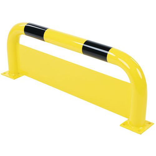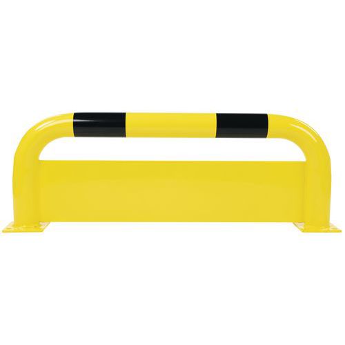 Arceau de protection avec plaque additionnelle pour prévenir des chocs dus aux fourches des engins. Plaque anti-encastrement de construction robuste. Revêtement noir/jaune pour signaler le danger de façon visible. Fixation via platine à sceller.
