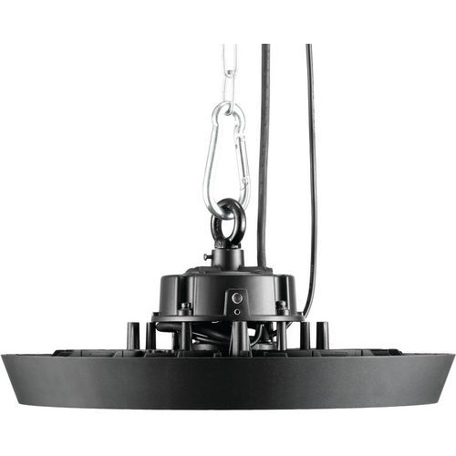 - Corps aluminium, suspension de type chaîne et mousqueton.Armature industrielle LED pour grande hauteur dans son modèle Granit.