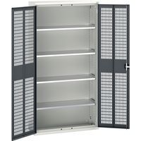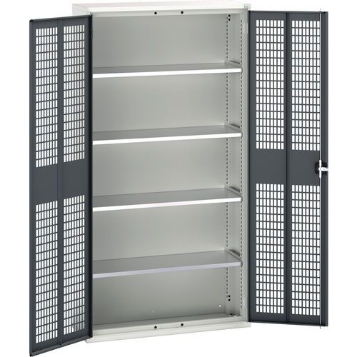 Construction en tôle d’acier soudé Portes renforcées avec fermeture par crémone 3 points Portes ventilées pour une bonne aération et visualisation du contenu Tablettes en acier galvanisé réglable au pas de 25 mm Charge par tablette 60 kg Conseils de sécurité : - installer le meuble sur une surface plane - le fixer sur un mur ou une cloison avec une fixation adaptée - veiller à ne pas dépasser la charge maximum conseillée, ainsi qu’à sa bonne répartition Fabriqué au RU Charge maxi (kg) : 1000 kg Charge maxi par tablette (kg) : 75 kg