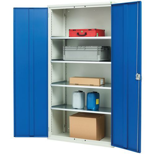 Armoire à portes battantes en tôle d’acier soudé avec renforts pour une utilisation en milieu industriel. Ouverture et fermeture aisées, même à pleine charge. Profondeur unique de 550 mm. Conseils de sécurité : - installer le meuble sur une surface plane - le fixer sur un mur ou une cloison avec une fixation adaptée - veiller à ne pas dépasser la charge maximum conseillée, ainsi qu’à sa bonne répartition Fabriqué au RU Charge maxi (kg) : 1000 Charge maxi par tablette (kg) : 75