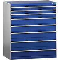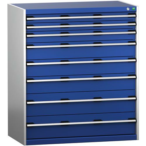 Equerres de renfort pour une meilleure rigidité, charge admissible : 1 tonne Tiroirs standard pour charges 75 Kg. Montés sur roulements avec une extension télescopique à 100% (ouverture totale). Poignées ergonomiques permettant le passage de la main par de dessus ou le dessous, système de blocage des tiroirs en standard, verrouillage individuel des tiroirs disponible en option. Conseils de sécurité : - installer le meuble sur une surface plane - le fixer sur un mur ou une cloison avec une fixation adaptée - veiller à ne pas dépasser la charge maximum conseillée, ainsi qu’à sa bonne répartition Fabriqué au RU Charge maxi (kg) : 1500 kg