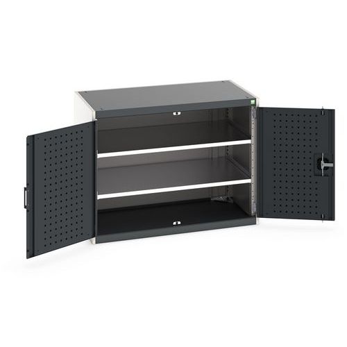 Armoire idéale de très grande capacité de stockage. Système de verrouillage par serrure rotative pour que vos affaires soient en sécurité. Créez plus d’espace de rangement en y ajoutant des tablettes ou un fond perforé. Convient également pour suspendre des bacs, en combinaison avec des panneaux avec habillage à bacs.