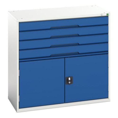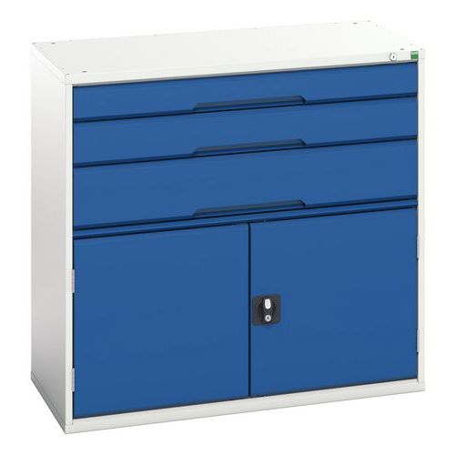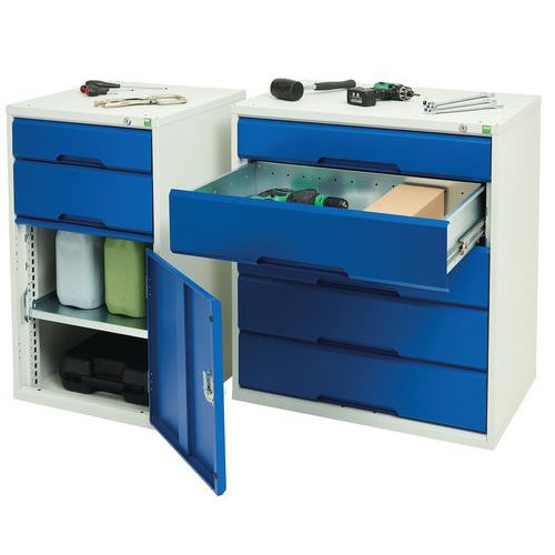 Armoire combinée en tôle d’acier soudé avec renforts pour une utilisation en milieu industriel. Tiroirs montés sur glissières à roulements supportant une charge de 60 Kg. Ouverture et fermeture aisées, même à pleine charge. Fermeture des tiroirs par verrouillage centralisé. Profondeur unique de 550 mm. Conseils de sécurité : - installer le meuble sur une surface plane - le fixer sur un mur ou une cloison avec une fixation adaptée - veiller à ne pas dépasser la charge maximum conseillée, ainsi qu’à sa bonne répartition
