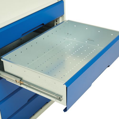 Armoire combinée en tôle d’acier soudé avec renforts pour une utilisation en milieu industriel. Tiroirs montés sur glissières à roulements supportant une charge de 60 Kg. Ouverture et fermeture aisées, même à pleine charge. Fermeture des tiroirs par verrouillage centralisé. Profondeur unique de 550 mm. Conseils de sécurité : - installer le meuble sur une surface plane - le fixer sur un mur ou une cloison avec une fixation adaptée - veiller à ne pas dépasser la charge maximum conseillée, ainsi qu’à sa bonne répartition Fabriqué au RU Charge maxi par tablette (kg) : 75 kg Charge maxi (kg) : 1000 kg