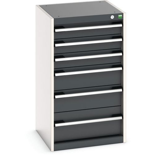 Armoire à tiroirs très robuste et de haute qualité. Tiroirs extractibles et pleinement accessibles. Glissières avec fermeture automatique et blocage de sécurité empêchant l'ouverture intempestive. Les poignées des tiroirs peuvent accueillir une étiquette. Avec verrouillage central des tiroirs. Fabriqué au RU Charge maxi (kg) : 1500 kg