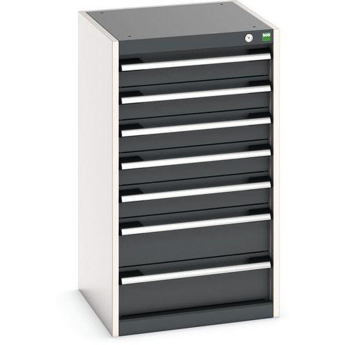 Armoire à tiroirs très robuste et de haute qualité. Tiroirs extractibles et pleinement accessibles. Glissières avec fermeture automatique et blocage de sécurité empêchant l'ouverture intempestive. Les poignées des tiroirs peuvent accueillir une étiquette. Avec verrouillage central des tiroirs. Fabriqué au RU Charge maxi (kg) : 1500 kg