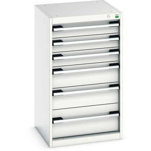 Armoire à tiroirs très robuste et de haute qualité. Tiroirs extractibles et pleinement accessibles. Glissières avec fermeture automatique et blocage de sécurité empêchant l'ouverture intempestive. Les poignées des tiroirs peuvent accueillir une étiquette. Avec verrouillage central des tiroirs. Fabriqué au RU Charge maxi (kg) : 1500 kg