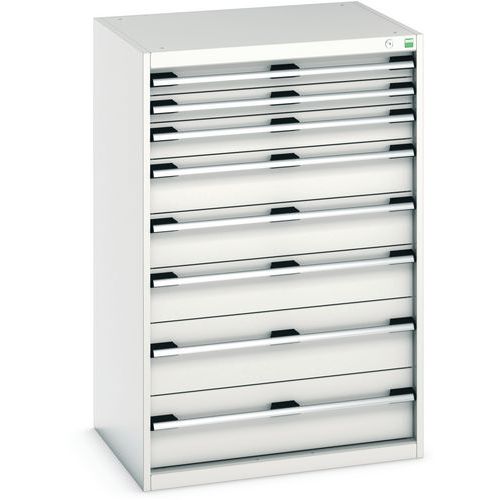 Armoire à tiroirs très robuste et de haute qualité. Tiroirs extractibles et pleinement accessibles. Glissières avec fermeture automatique et blocage de sécurité empêchant l'ouverture intempestive. Les poignées des tiroirs peuvent accueillir une étiquette. Avec verrouillage central des tiroirs. Conseils de sécurité : - installer le meuble sur une surface plane - le fixer sur un mur ou une cloison avec une fixation adaptée - veiller à ne pas dépasser la charge maximum conseillée, ainsi qu’à sa bonne répartition Fabriqué au RU Charge maxi (kg) : 1500 kg