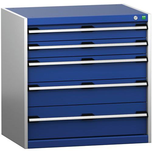 Armoire à tiroirs très robuste et de haute qualité. Tiroirs extractibles et pleinement accessibles. Glissières avec fermeture automatique et blocage de sécurité empêchant l'ouverture intempestive. Fabriqué au RU Charge maxi (kg) : 1500 kg
