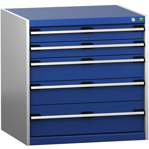 Armoire à tiroirs très robuste et de haute qualité. Tiroirs extractibles et pleinement accessibles. Glissières avec fermeture automatique et blocage de sécurité empêchant l'ouverture intempestive. Fabriqué au RU Charge maxi (kg) : 1500 kg