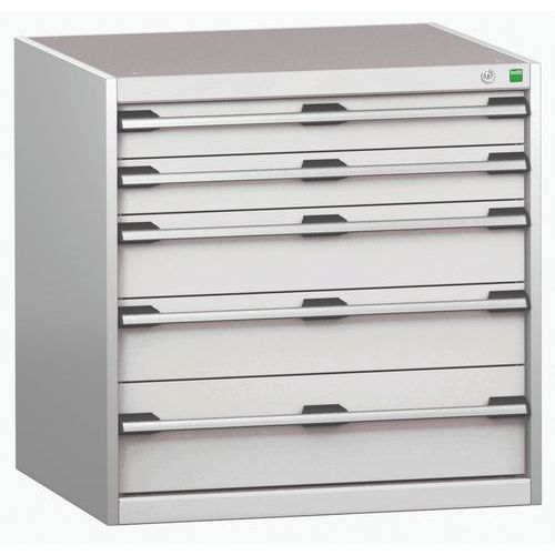 Armoire à tiroirs très robuste et de haute qualité. Tiroirs extractibles et pleinement accessibles. Glissières avec fermeture automatique et blocage de sécurité empêchant l'ouverture intempestive. Fabriqué au RU Charge maxi (kg) : 1500 kg