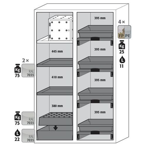 Stockage sécurisé et certifié des substances chimiques dangereuses, inflammables et corrosives dans les zones de travail Fonction / Construction : Robuste et durable : structure extérieure solide en acier revêtu époxy, 3 charnières de fixation par porte, mécanisme de fermeture complet et éléments de sécurité protégés contre la corrosion montés hors de la zone de stockage Deux en un : deux compartiments (division verticale) permettant le stockage de substances dangereuses inflammables et corrosives dans une même armoire Pratique et sûr : 1 compartiment avec porte pliable, système de maintien de porte (standard), retrait ou stockage pratique et sans risques des récipients Toujours fermée : le dispositif de fermeture de porte automatique (TSA) activé en permanence libère les portes après environ 60 secondes , signal acoustique et visuel avant la fermeture Utilisation controlée : portes verrouillables avec serrure profilée et serrure à cylindre Installation facile : pieds réglables intégrés Aération et ventilation : système d'aération et de ventilation intégrés pour le raccordement (diamètre 75 mm) à un dispositif technique d'évacuation d'air Fabriqué en Allemagne