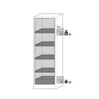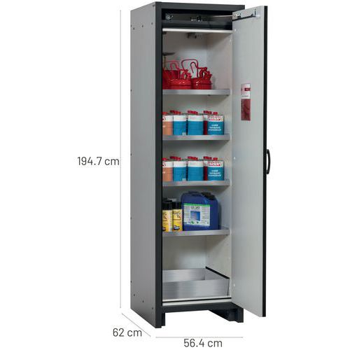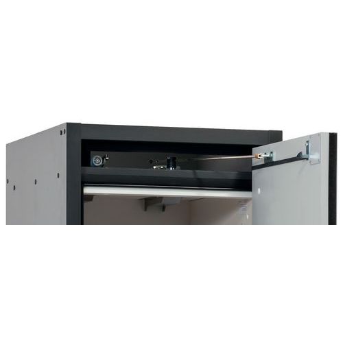 Stockage sécurisé, conforme à la réglementation en vigueur des produits dangereux, inflammables dans les zones de travail Fonction / Construction : Robuste et durable : structure extérieure solide en plaques ignifugées revêtues d'une résine de mélamine, 3 charnières de fixation de porte, mécanisme de fermeture complet et éléments de sécurité protégés contre la corrosion montés hors de la zone de stockage, porte de qualité, résistante aux rayures avec surface structurée revêtue époxy Ergonomique : la porte restent à la position lors de l´ouverture, fermeture automatique en cas d'incendie Utilisation controlée : porte verrouillable, compatible avec fermeture centralisée Transport facile : socle de transport intégré, en option plinthe de finition simple ou plinthe complétée de 4 pieds de mise à niveau Aération et ventilation : système d'aération et de ventilation intégrés pour le raccordement (diamètre 75 mm) à un dispositif technique d'évacuation d'air