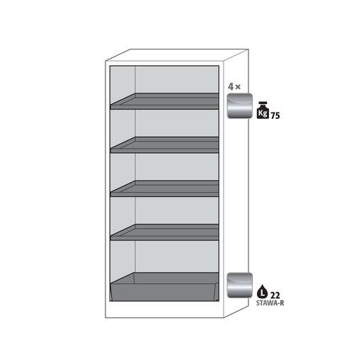 Stockage sécurisé, conforme à la réglementation en vigueur des produits dangereux, inflammables dans les zones de travail Fonction / Construction : Robuste et durable : structure extérieure solide en plaques ignifugées revêtues d'une résine de mélamine, 3 charnières de fixation de porte, mécanisme de fermeture complet et éléments de sécurité protégés contre la corrosion montés hors de la zone de stockage, porte de qualité, résistante aux rayures avec surface structurée revêtue époxy Ergonomique : la porte restent à la position lors de l´ouverture, fermeture automatique en cas d'incendie Utilisation controlée : porte verrouillable, compatible avec fermeture centralisée Transport facile : socle de transport intégré, en option plinthe de finition simple ou plinthe complétée de 4 pieds de mise à niveau Aération et ventilation : système d'aération et de ventilation intégrés pour le raccordement (diamètre 75 mm) à un dispositif technique d'évacuation d'air