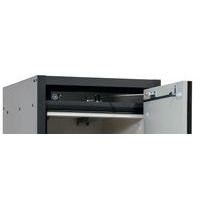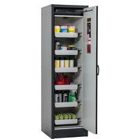 Stockage sécurisé, conforme à la réglementation en vigueur des produits dangereux, inflammables dans les zones de travail Fonction / Construction : Robuste et durable : structure extérieure solide en plaques ignifugées revêtues d'une résine de mélamine, 3 charnières de fixation de porte, mécanisme de fermeture complet et éléments de sécurité protégés contre la corrosion montés hors de la zone de stockage, porte de qualité, résistante aux rayures avec surface structurée revêtue époxy Ergonomique : la porte restent à la position lors de l´ouverture, fermeture automatique en cas d'incendie Utilisation controlée : porte verrouillable, compatible avec fermeture centralisée Transport facile : socle de transport intégré, en option plinthe de finition simple ou plinthe complétée de 4 pieds de mise à niveau Aération et ventilation : système d'aération et de ventilation intégrés pour le raccordement (diamètre 75 mm) à un dispositif technique d'évacuation d'air