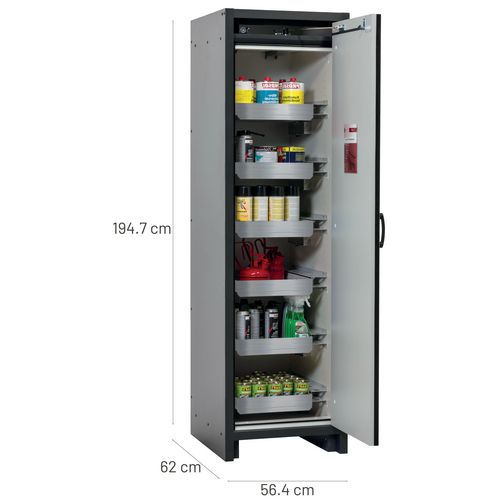 Stockage sécurisé, conforme à la réglementation en vigueur des produits dangereux, inflammables dans les zones de travail Fonction / Construction : Robuste et durable : structure extérieure solide en plaques ignifugées revêtues d'une résine de mélamine, 3 charnières de fixation de porte, mécanisme de fermeture complet et éléments de sécurité protégés contre la corrosion montés hors de la zone de stockage, porte de qualité, résistante aux rayures avec surface structurée revêtue époxy Ergonomique : la porte restent à la position lors de l´ouverture, fermeture automatique en cas d'incendie Utilisation controlée : porte verrouillable, compatible avec fermeture centralisée Transport facile : socle de transport intégré, en option plinthe de finition simple ou plinthe complétée de 4 pieds de mise à niveau Aération et ventilation : système d'aération et de ventilation intégrés pour le raccordement (diamètre 75 mm) à un dispositif technique d'évacuation d'air Charge maxi (kg) : 600 kg