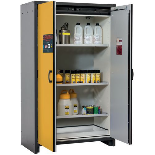 Stockage sécurisé des produits dangereux, inflammables dans les zones de travail. Robuste et durable grâce à sa structure extérieure solide en plaques ignifugées. Ergonomique avec un maintien des portes en toute position. Fermeture automatique en cas d'incendie. Portes verrouillables avec un système de fermeture centralisée pour une utilisation contrôlée.