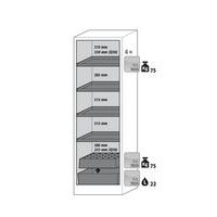 Stockage sécurisé, conforme à la réglementation en vigueur des produits dangereux, inflammables dans les zones de travail Fonction / Construction : Robuste et durable : structure extérieure acier, résistante aux rayures, peinture époxy, 3 charnières de fixation de porte, fermeture protégé contre la corrosion Ergonomique : la porte restent à la position lors de l´ouverture, fermeture automatique en cas d'incendie Utilisation controlée : porte verrouillable, compatible avec fermeture centralisée, indicateur de verrouillage des portes (rouge/vert) Transport facile : socle de transport intégré, plinthe disponible en option Installation facile : pieds réglables intégrés Aération et ventilation : système d'aération et de ventilation pour le raccordement à un système d´extraction ou de ventilation filtrée autonome, hélice sur la grille d'évacuation indiquant une ventilation Fabriqué en Allemagne Charge maxi (kg) : 600 kg