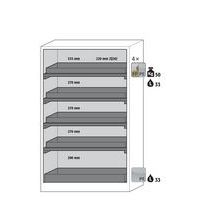 Stockage sécurisé, conforme à la réglementation en vigueur des produits dangereux, inflammables dans les zones de travail Fonction / Construction : Robuste et durable : structure extérieure acier, résistante aux rayures, peinture époxy, 3 charnières de fixation de porte, fermeture protégé contre la corrosion Ergonomique : ouverture des deux portes avec une seule main (AGT) Confort de travail : rappel automatique des portes, maintien des portes en position ouverte, stockage sécurisé des récipients Toujours fermée : le dispositif automatique de fermeture des portes de série (TSA) libère les portes maintenues en position ouverte au bout de 60 secondes, alarmes visuelle et sonore avant la fermeture des portes Utilisation controlée : portes verrouillables, compatible avec fermeture centralisée, indicateur de verrouillage des portes (rouge/vert) Transport facile : socle de transport intégré, plinthe disponible en option Installation facile : pieds réglables intégrés Aération et ventilation : système d'aération et de ventilation pour le raccordement à un système d´extraction ou de ventilation filtrée autonome, hélice sur la grille d'évacuation indiquant une ventilation