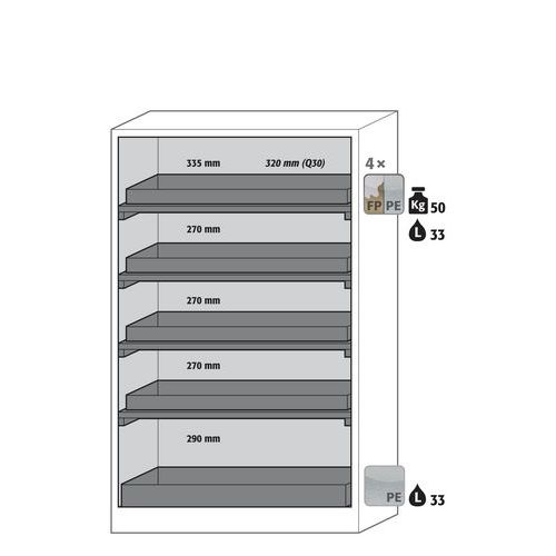 Stockage sécurisé, conforme à la réglementation en vigueur des produits dangereux, inflammables dans les zones de travail Fonction / Construction : Robuste et durable : structure extérieure acier, résistante aux rayures, peinture époxy, 3 charnières de fixation de porte, fermeture protégé contre la corrosion Ergonomique : ouverture des deux portes avec une seule main (AGT) Confort de travail : rappel automatique des portes, maintien des portes en position ouverte, stockage sécurisé des récipients Toujours fermée : le dispositif automatique de fermeture des portes de série (TSA) libère les portes maintenues en position ouverte au bout de 60 secondes, alarmes visuelle et sonore avant la fermeture des portes Utilisation controlée : portes verrouillables, compatible avec fermeture centralisée, indicateur de verrouillage des portes (rouge/vert) Transport facile : socle de transport intégré, plinthe disponible en option Installation facile : pieds réglables intégrés Aération et ventilation : système d'aération et de ventilation pour le raccordement à un système d´extraction ou de ventilation filtrée autonome, hélice sur la grille d'évacuation indiquant une ventilation Fabriqué en Allemagne Charge maxi (kg) : 600 kg