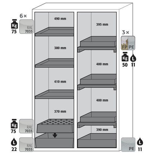 Stockage sécurisé, conforme à la réglementation en vigueur des produits dangereux, inflammables dans les zones de travail Fonction / Construction : Robuste et durable : structure extérieure solide en acier revêtu époxy, 3 charnières de fixation par porte, mécanisme de fermeture complet et éléments de sécurité protégés contre la corrosion montés hors de la zone de stockage Deux en un : deux compartiments (division verticale) permettant le stockage de substances dangereuses inflammables et corrosives dans une même armoire Portes pliables à faible encombrement : moins d'espace requis devant l'armoire lorsque les portes sont ouvertes Confort de travail : rappel automatique des portes, maintien des portes en position ouverte, stockage sécurisé des récipients Utilisation controlée : portes verrouillables avec un système de fermeture centralisée (passe) Installation facile : pieds réglables intégrés Aération et ventilation : système d'aération et de ventilation intégrés pour le raccordement (diamètre 75 mm) à un dispositif technique d'évacuation d'air Fabriqué en Allemagne Charge maxi (kg) : 600 kg