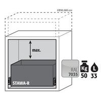 Stockage sécurisé, conforme à la réglementation en vigueur des produits dangereux, inflammables dans les zones de travail Fonction / construction: Robuste et durable: structure extérieure en acier revêtu époxy Confort de travail: blocage des portes dans toutes les positions, accès sûr à tous les récipients – angle d'ouverture des portes 93°, intérieur de l'armoire visible dans son intégralité Utilisation controlée: portes verrouillables avec serrure, indicateur de verrouillage des portes (rouge/vert) Mobile: socle avec roulettes en option, pour un déplacement facile de l'armoire Aération et ventilation: système d'aération et de ventilation intégré pour le raccordement (diamètre 50 mm) à un dispositif technique d'évacuation d'air Charge maxi (kg) : 600 kg