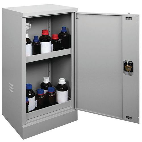 Armoire de stockage permettant le stockage de vos produits dangereux en toute sécurité. Orifices de ventilation pour raccordement à une ventilation Possède des étagères ajustables. Fermeture de porte manuelle. Garantie client : 10 ans