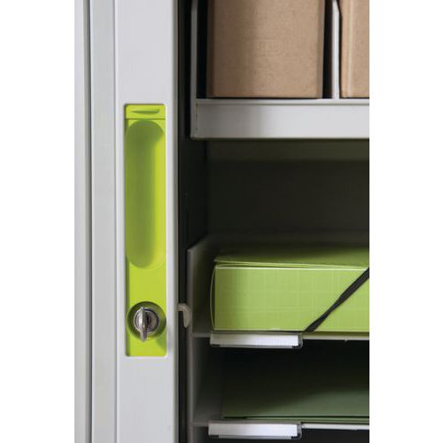 Armoire de bureau Easy Office hauteur 104 cm, solide. Angles arrondis et dessus de finition laqué. Poignée encastrée avec cache de finition. Structure interne et tablette en acier. Serrure à double sortie livrée avec 1 jeu de 2 clés. Tablettes métal coloris noir équipées pour dossiers suspendus. Réglables tous les 8 cm. Charge utile : 75 kg répartis. Rideau polypropylène s'escamotant totalement sur les côtés pour accessibilité maximum de l'armoire. Livrées à plat avec notice de montage.