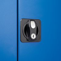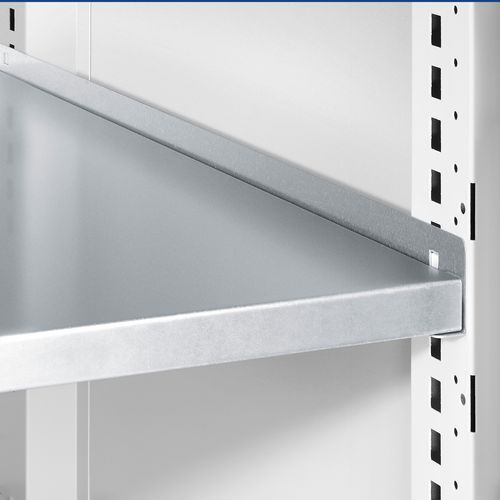 Fermeture par crémone 3 points (double portes en largeur 800 et 1050 mm, simple porte en largeur 525 mm) Tablettes en acier galvanisé réglables au pas de 25 mm, charge de 60 Kg 350mm profondeur Fabriqué au RU Charge maxi (kg) : 1000 kg Charge maxi par tablette (kg) : 75 kg