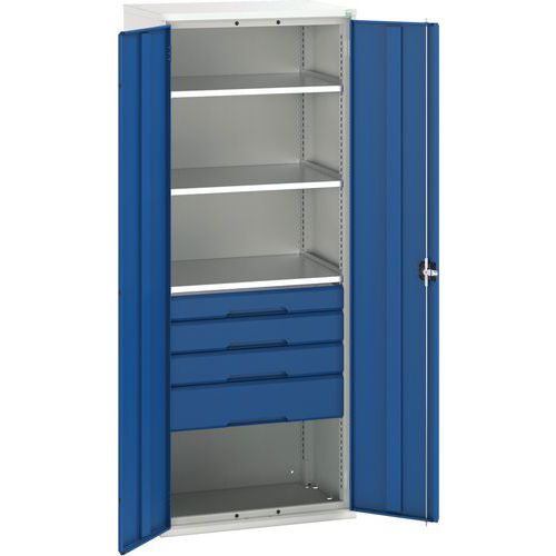 Construction en tôle d’acier avec portes renforcées Tablettes en acier galvanisé réglables au pas de 25mm Charge par tablette et tiroir 60 Kg Tiroirs intérieurs montés sur roulements Profondeur 550 mm Conseils de sécurité : - installer le meuble sur une surface plane - le fixer sur un mur ou une cloison avec une fixation adaptée - veiller à ne pas dépasser la charge maximum conseillée, ainsi qu’à sa bonne répartition Fabriqué au RU Charge maxi (kg) : 1000 kg Charge maxi par tablette (kg) : 75 kg