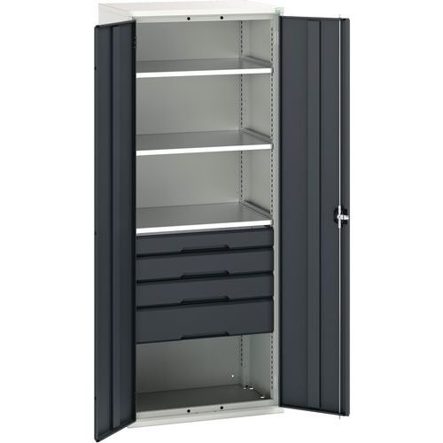 Construction en tôle d’acier avec portes renforcées Tablettes en acier galvanisé réglables au pas de 25mm Charge par tablette et tiroir 60 Kg Tiroirs intérieurs montés sur roulements Profondeur 550 mm Conseils de sécurité : - installer le meuble sur une surface plane - le fixer sur un mur ou une cloison avec une fixation adaptée - veiller à ne pas dépasser la charge maximum conseillée, ainsi qu’à sa bonne répartition Fabriqué au RU Charge maxi (kg) : 1000 kg Charge maxi par tablette (kg) : 75 kg