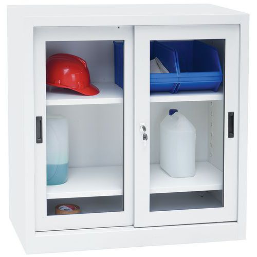 Armoire d'atelier basse en acier (,9 mm d'épaisseur). Vitrine en verre trempé. Avec doubles portes coulissantes pour économiser de l'espace. Déterminez vous-même la hauteur de vos tablettes. Fermeture sécurisée grâce à la serrure. Vérifiez rapidemet le contenu grâce aux portes transparences. Conseils de sécurité : - installer le meuble sur une surface plane - le fixer sur un mur ou une cloison avec une fixation adaptée - veiller à ne pas dépasser la charge maximum conseillée, ainsi qu’à sa bonne répartition