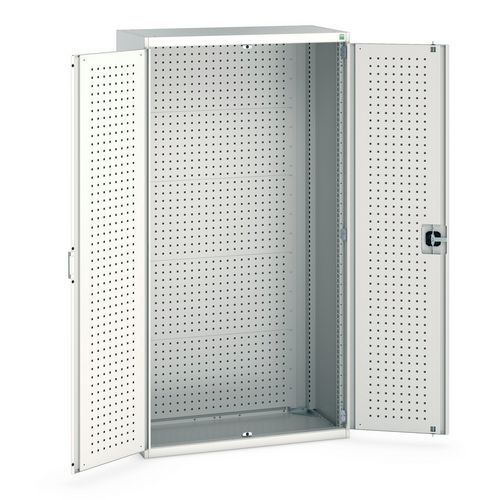 Armoire d’atelier pour le rangement clair de vos outils. Avec perforations et panneau avec habillage à bacs. Verrouillez les portes de manière sécurisée grâce au dispositif de fermeture à trois points et à la serrure à cylindre.