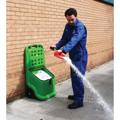 Bac à sel ou à sable de petit format et mobile en polyéthylène. Roues en caoutchouc et poignées de préhension ergonomique. Résiste à la plupart des produits chimiques, s'utilise en intérieur et en extérieur. Ferme avec joints et grenouillère. Poignées de manutention. Fabriqué au RU Garantie client : 3 ans