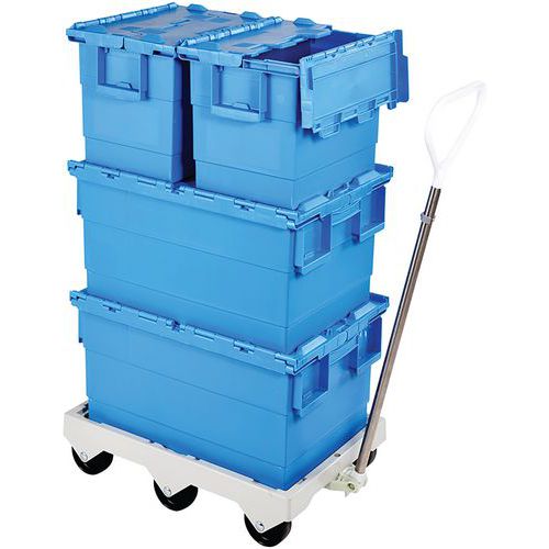 Bac avec couvercle crocodile intégré. Empilable fermé et emboîtable lorsque le couvercle est ouvert. Poignées ouvertes