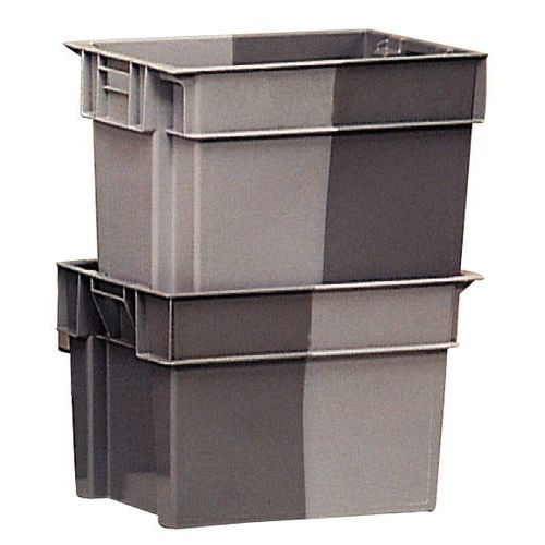 Emboîtable à 60% pour gain de place à vide. Manipulation confortable via ses larges poignées ergonomiques. Compatible avec tout type de convoyeur grâce à son fond lisse. Positions gerbage/emboîtement facilement identifiables par structure bicolore.