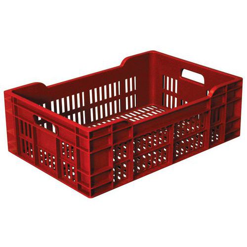 Caisse ajourée empilables Idéale pour le stockage des fruits et des légumes. Aération du contenu. Très résistante en utilisation intensive. Poignées intégrées ergonomiques pour une préhension facile et pratique. Couvercles caisses pleines adaptés également aux caisses ajourées. Les caisses ajourées 600x400 sont compatibles avec les socles 4 et 6 roues GILAC. Couvercles caisses pleines adaptés également aux caisses ajourées. Les caisses ajourées 600x400 sont compatibles avec les socles 4 et 6 roues GILAC. Froid/Surgelé Charge maxi (kg) : 60 kg Usage alimentaire