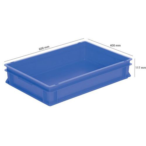 Bac gerbable norme Europe. Equipé de parois pleines, fond plein et poignées coquilles. Charge maxi (kg) : 20 kg Garantie client : 3 ans Usage alimentaire