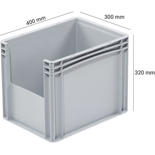 | Intitulé du produit | Bac norme Europe à ouverture frontrale, Capacité: 30 L, Gerbable: oui, Hauteur hors tout: 320 mm |