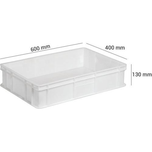 | Intitulé du produit | Bac Norme Europe à parois et fonds pleins, Capacité: 24 L, Gerbable: oui, Hauteur hors tout: 130 mm |
