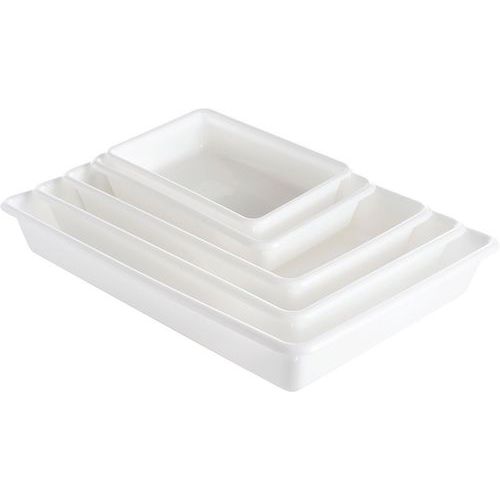 Bac plat multi-usages alimentaires : préparation, marinade, décantation, décongélation, stockage d'échantillons témoins... Spécialement étudié pour l'industrie alimentaire. Encombrement minimal par emboîtement à vide. format parfaitement adapté aux réfrigérateur.