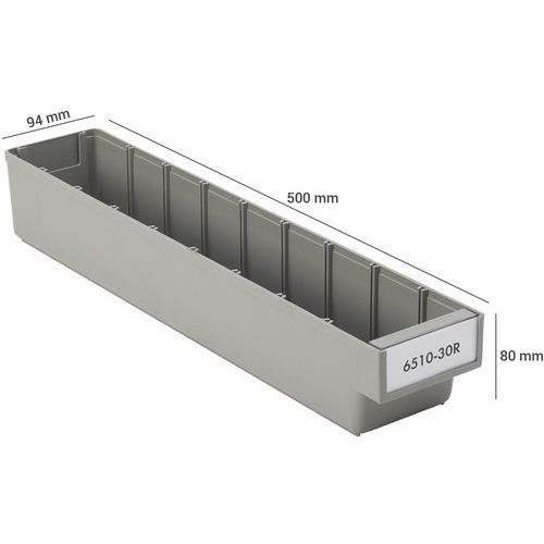 Bacs pour étagère. S’intègrent facilement dans les systèmes de rayonnages standard. Trois profondeurs : 300 mm, 400 mm et 500 mm. Existent également en version empilable. Les bacs ont des parois droites. Les étiquettes en carton sont livrées de série. Séparateurs transversaux transparents (polystyrène recyclé).